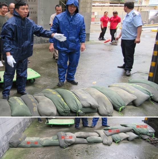 演練設(shè)想突發(fā)暴雨災(zāi)害導(dǎo)致廣德大廈停車場(chǎng)地下車庫(kù)水位迅速升高,車場(chǎng)入口雨水倒灌,危及車輛和升降設(shè)備安全,要迅速防洪排洪解除危險(xiǎn)。在應(yīng)急指揮中心下達(dá)指令后,各演練分組迅速到位,立即啟動(dòng)車場(chǎng)地下車庫(kù)排水泵,搶險(xiǎn)人員穿上水鞋和雨衣,用推車搬運(yùn)沙袋到車庫(kù)入口堆放,阻擋對(duì)面馬路的雨水倒灌入車場(chǎng),雨水過(guò)后清潔人員清理現(xiàn)場(chǎng)淤泥,恢復(fù)生產(chǎn)。