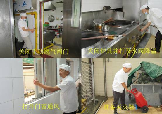 演練模擬飯?zhí)霉ぷ魅藛T在做飯過程聞到燃氣異味,燃氣自動關閉裝置暫未有動作,于是立即出來報告,并順路關閉手動燃氣閥門。其他飯?zhí)霉ぷ魅藛T也隨即關閉燃氣爐具,相互提醒嚴禁觸摸電器開關,打開爐具專用水閥放水降溫,在撤退過程準備好滅火器,打開窗戶透氣。現(xiàn)場控制組在接到應急指揮中心的命令后,對飯?zhí)贸鋈肟诶鹁渚€,接上消防水帶模擬對現(xiàn)場降溫,對需要進入泄漏區(qū)關閉上端燃氣閥門的排險人員,確認沒有穿帶釘鞋和化纖衣服,沒有攜帶使用金屬工具。